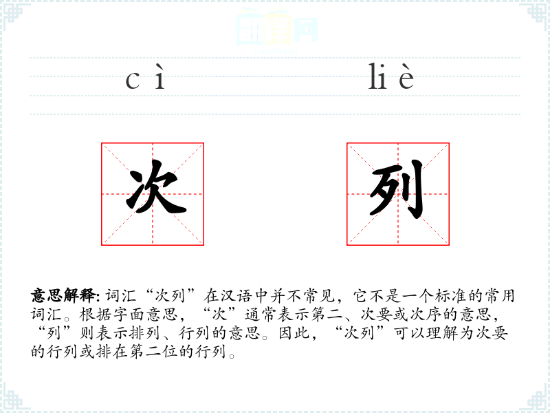 词汇“次列”在汉语中并不常见,它不是一个标准的常用词汇。根据字面意思,“次”通常表示第二、次要或次序的意思,“列”则表示排列、行列的意思。因此,“次列”可以理解为次要的行列或排在第二位的行列。