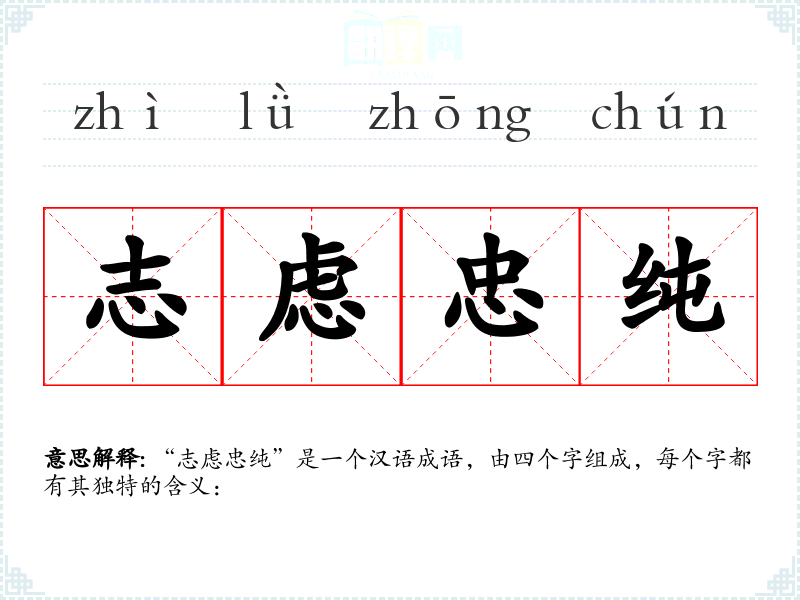 “志虑忠纯”是一个汉语成语,由四个字组成,每个字都有其独特的含义: