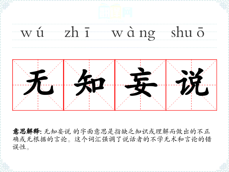 无知妄说 的字面意思是指缺乏知识或理解而做出的不正确或无根据的言论。这个词汇强调了说话者的****和言论的错误性。