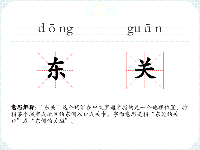 “东关”这个词汇在中文里通常指的是一个地理位置,特指某个城市或地区的东侧入口或关卡。字面意思是指“东边的关口”或“东侧的关隘”。