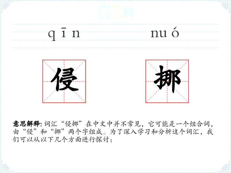 “侵”和“挪”都是汉语中的基本词汇,它们的组合可能是为了强调一种特定的非法行为。这个词可能在法律术语中较为常见,随着社会和法律的发展,其含义和使用可能有所演变。