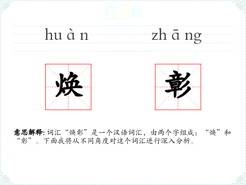 - 词源:“焕”和“彰”都是古代汉语词汇,历史悠久。