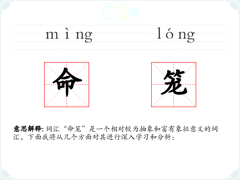 词汇“命笼”是一个相对较为抽象和富有象征意义的词汇,下面我将从几个方面对其进行深入学*和分析: