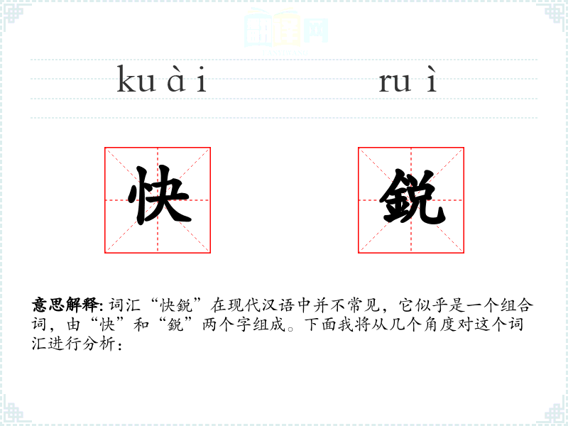 词汇“快鋭”在现代汉语中并不常见,它似乎是一个组合词,由“快”和“鋭”两个字组成。下面我将从几个角度对这个词汇进行分析: