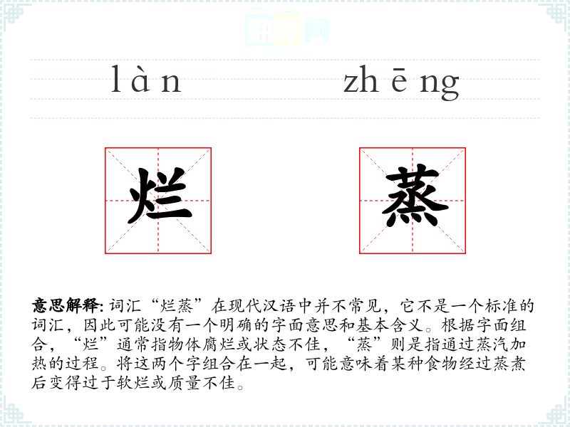 由于“烂蒸”不是一个标准词汇,它的词源和演变难以追溯。它可能是由日常生活中的口语表达逐渐形成的词汇。