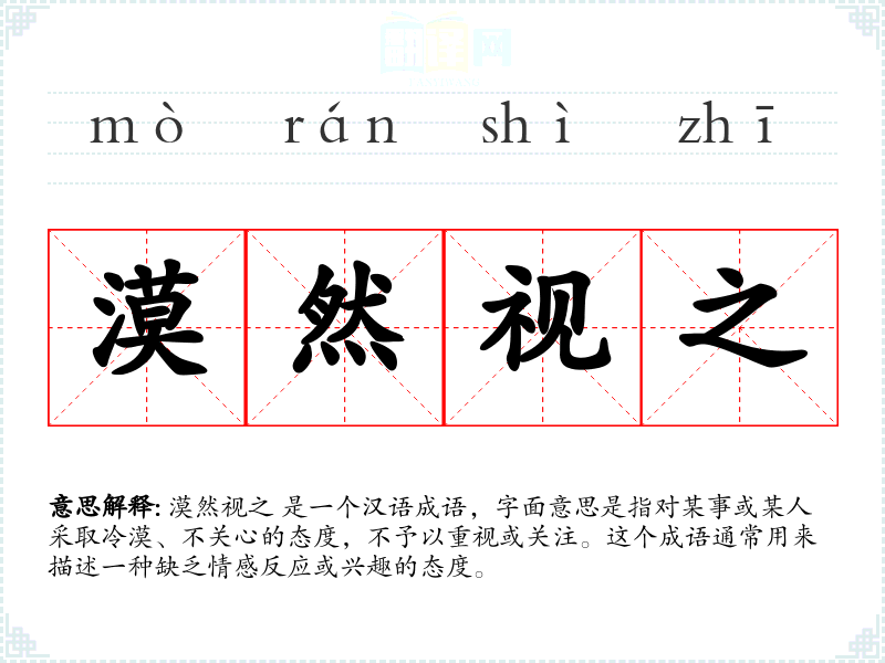 漠然视之 是一个汉语成语,字面意思是指对某事或某人采取冷漠、不关心的态度,不予以重视或关注。这个成语通常用来描述一种缺乏情感反应或兴趣的态度。