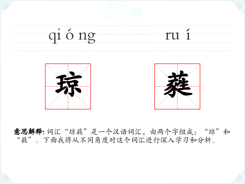 词汇“琼蕤”是一个汉语词汇,由两个字组成:“琼”和“蕤”。下面我将从不同角度对这个词汇进行深入学*和分析。