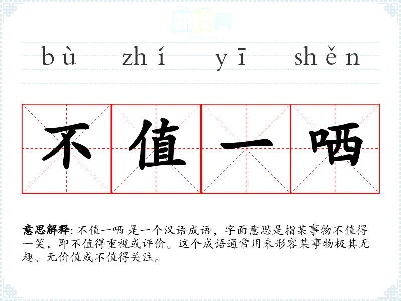 不值一哂 是一个汉语成语,字面意思是指某事物不值得一笑,即不值得重视或评价。这个成语通常用来形容某事物极其无趣、无价值或不值得关注。