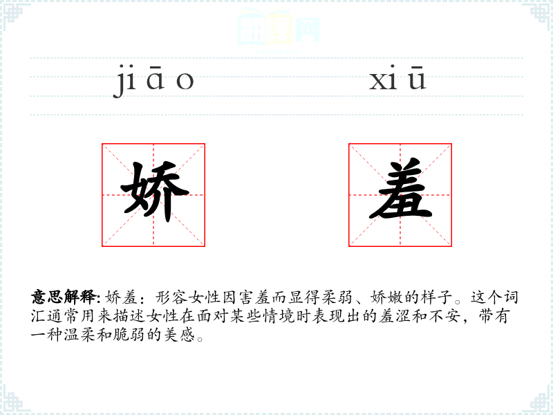 “娇羞”一词由“娇”和“羞”两个字组成。其中,“娇”字古已有之,意为柔弱、娇嫩;“羞”字则表示害羞、羞涩。这两个字组合在一起,形成了描述女性害羞时特有的柔弱美感的词汇。