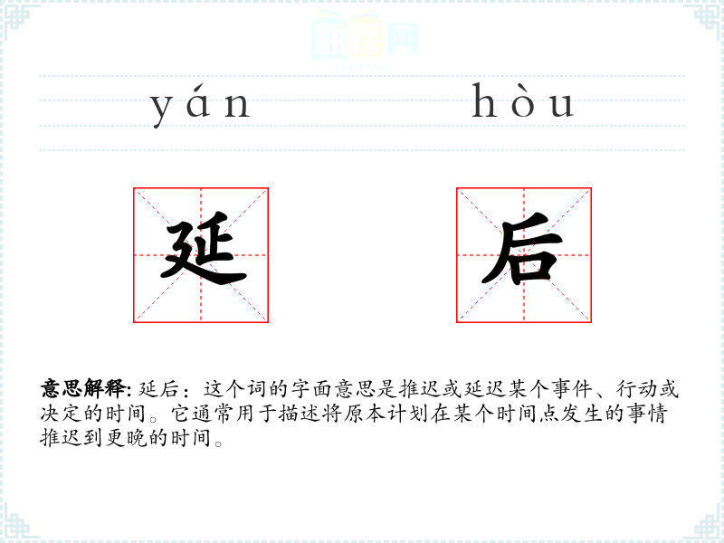 延后:这个词的字面意思是推迟或延迟某个**、行动或决定的时间。它通常用于描述将原本计划在某个时间点发生的事情推迟到更晚的时间。
