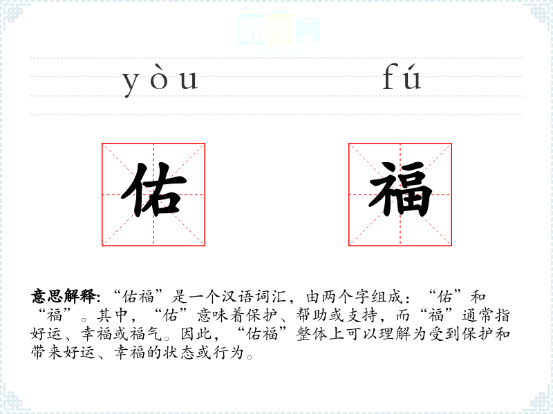 “佑福”是一个汉语词汇,由两个字组成:“佑”和“福”。其中,“佑”意味着保护、帮助或支持,而“福”通常指好运、幸福或福气。因此,“佑福”整体上可以理解为受到保护和带来好运、幸福的状态或行为。