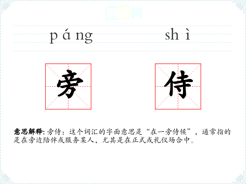 旁侍:这个词汇的字面意思是“在一旁侍候”,通常指的是在旁边陪伴或服务某人,尤其是在正式或礼仪场合中。