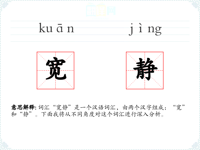 - 词源:“宽”和“静”都是古代汉语中就存在的词汇,各自有着悠久的历史。
