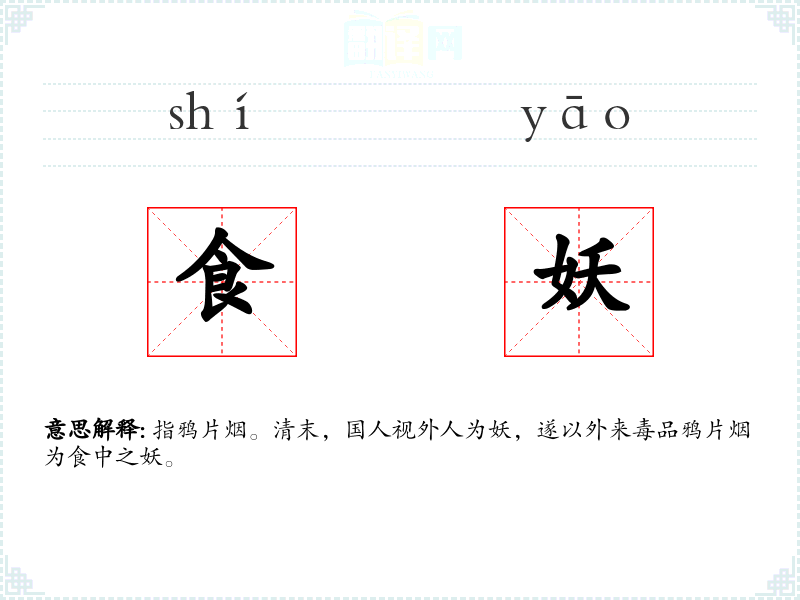 指鸦片烟。清末,国人视外人为妖,遂以外来毒品鸦片烟为食中之妖。