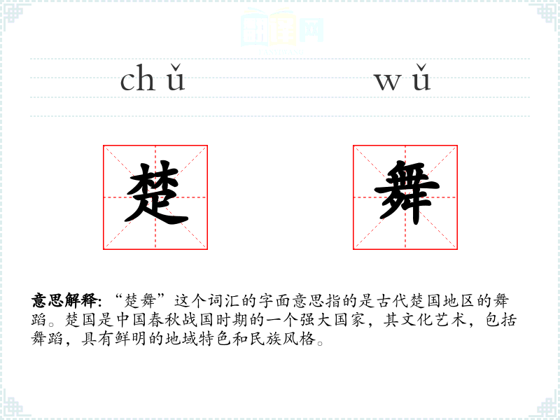 同义词:楚风舞、楚地舞蹈 反义词:(由于“楚舞”具有特定的地域和文化背景,反义词不太容易确定,可能需要根据具体语境来选择)