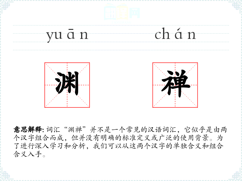 将这两个字组合起来,“渊禅”可能指的是一种深邃的冥想状态,或者是对深奥哲理的探索。