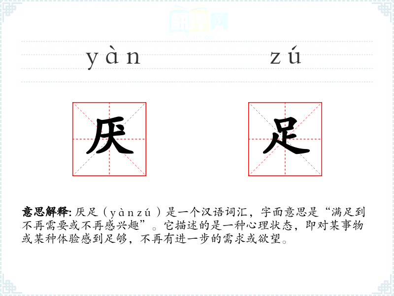 厌足(yàn zú)是一个汉语词汇,字面意思是“满足到不再需要或不再感兴趣”。它描述的是一种心理状态,即对某事物或某种体验感到足够,不再有进一步的需求或欲望。