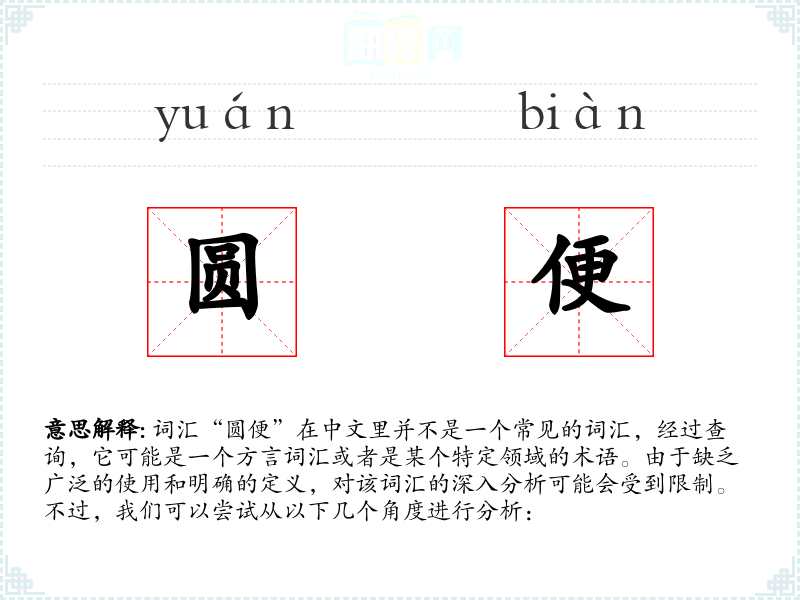 由于“圆便”不是一个标准的中文词汇,我们无法给出一个确切的字面意思和基本含义。它可能是指某种方便或便利的状态,或者是某个特定方言中的词汇。