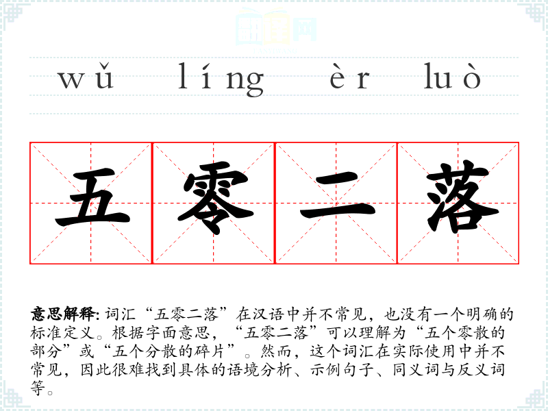 - 由于“五零二落”不是一个标准的汉语词汇,因此在其他语言或文化中没有对应的词汇。
