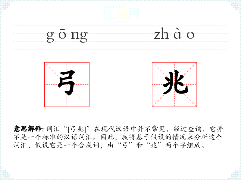 词汇“[弓兆]”在现代汉语中并不常见,经过查询,它并不是一个标准的汉语词汇。因此,我将基于假设的情况来分析这个词汇,假设它是一个合成词,由“弓”和“兆”两个字组成。