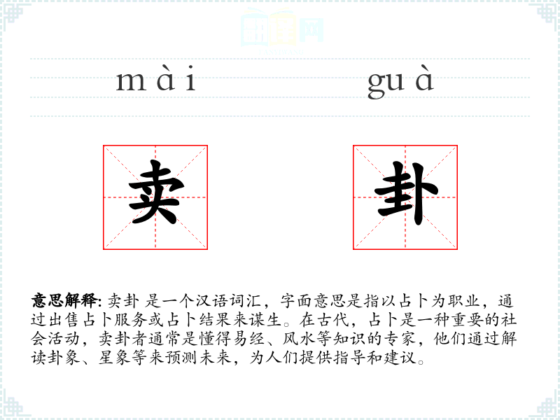 卖卦 是一个汉语词汇,字面意思是指以占卜为职业,通过出售占卜服务或占卜结果来谋生。在古代,占卜是一种重要的社会活动,卖卦者通常是懂得易经、风水等知识的专家,他们通过解读卦象、星象等来预测未来,为人们提供指导和建议。