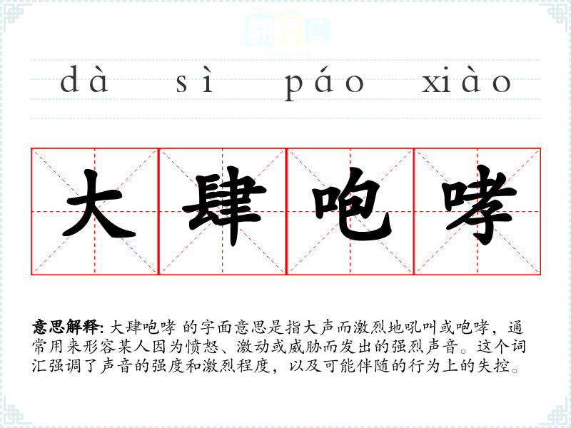 大肆 源自汉语,意为“*地”或“无节制地”,咆哮** 则源自古代汉语,原指野兽的吼叫声。这两个词组合在一起,强调了声音的强度和失控的状态。