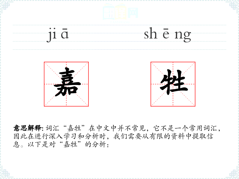 “嘉”字在古代汉语中有“好、优秀”的意思,“牲”指牲畜。因此,“嘉牲”合起来就是指优秀的牲畜。这个词可能在古代祭祀文化中较为常见,但随着时间的推移,它在日常语言中逐渐消失。