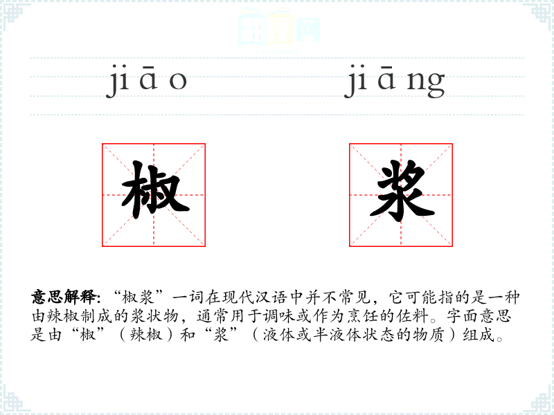 “椒浆”一词在现代汉语中并不常见,它可能指的是一种由辣椒制成的浆状物,通常用于调味或作为烹饪的佐料。字面意思是由“椒”(辣椒)和“浆”(液体或半液体状态的物质)组成。
