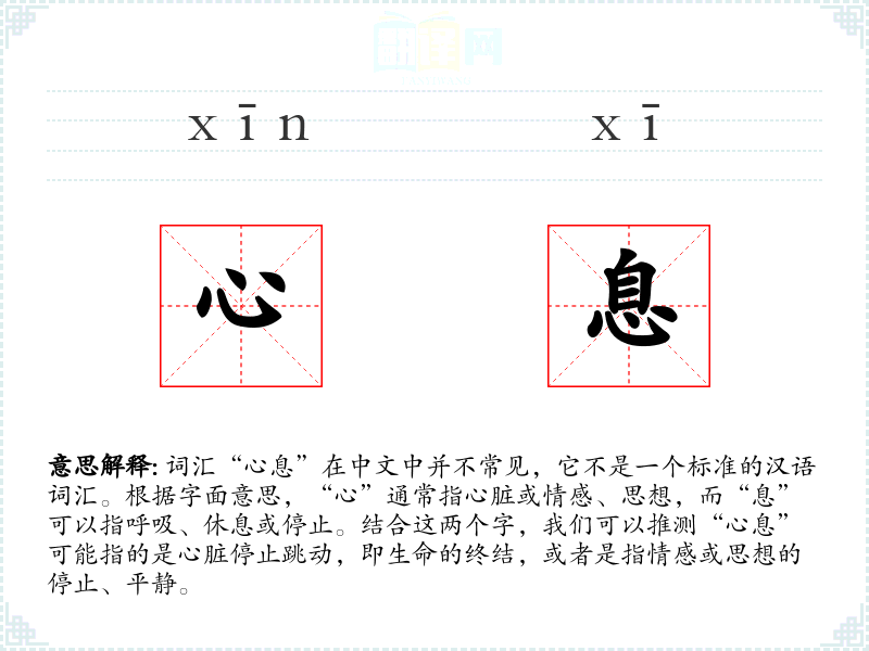 词汇“心息”在中文中并不常见,它不是一个标准的汉语词汇。根据字面意思,“心”通常指心脏或情感、思想,而“息”可以指呼吸、休息或停止。结合这两个字,我们可以推测“心息”可能指的是心脏停止跳动,即生命的终结,或者是指情感或思想的停止、平静。