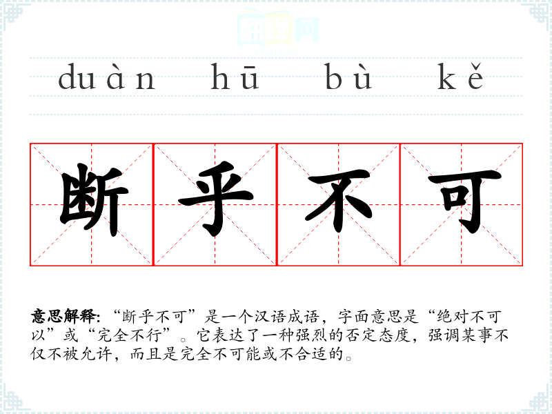 “断乎不可”是一个汉语成语,字面意思是“绝对不可以”或“完全不行”。它表达了一种强烈的否定态度,强调某事不仅不被允许,而且是完全不可能或不合适的。