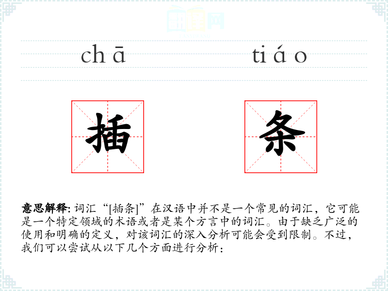 由于“[插条]”不是一个标准汉语词汇,我们无法给出一个确切的字面意思和基本含义。它可能是指插入某个物体中的条状物,或者是某个特定行业(如园艺、建筑等)中的术语。