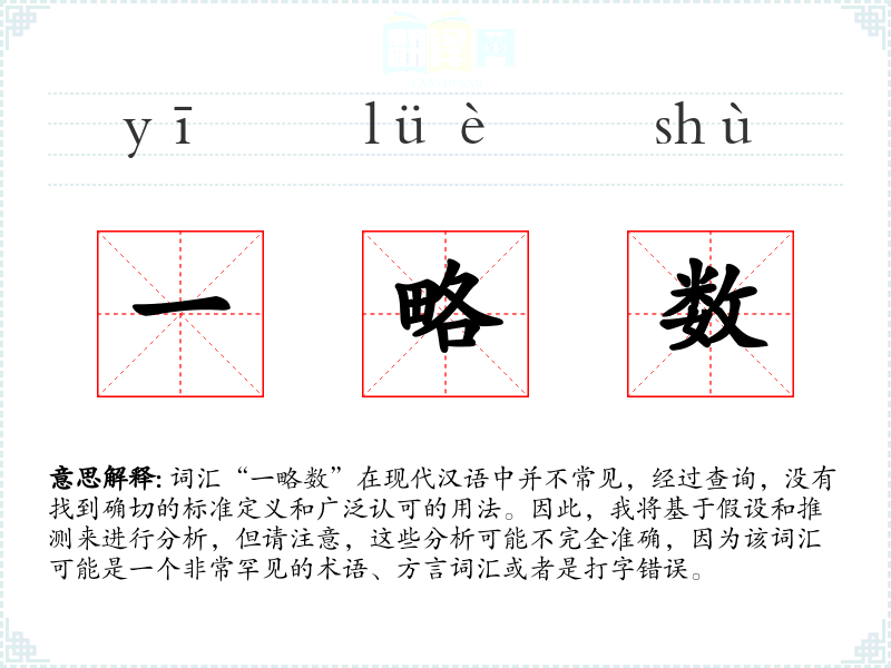 词汇“一略数”在现代汉语中并不常见,经过查询,没有找到确切的标准定义和广泛认可的用法。因此,我将基于假设和推测来进行分析,但请注意,这些分析可能不完全准确,因为该词汇可能是一个非常罕见的术语、方言词汇或者是打字错误。