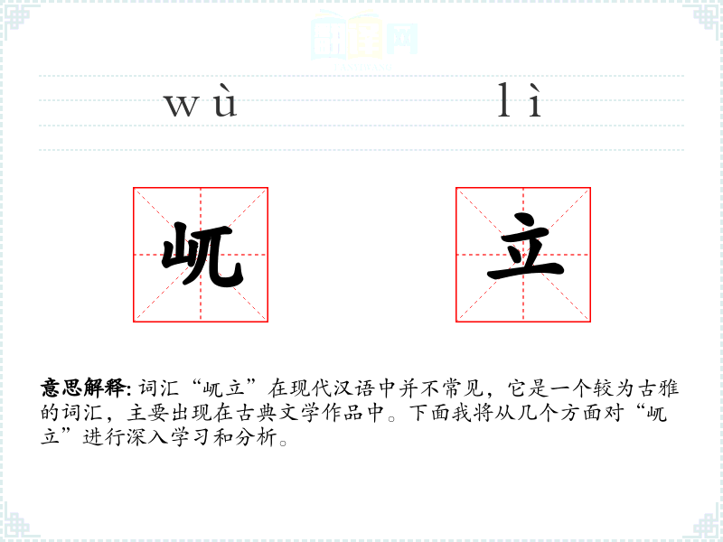 词汇“屼立”在现代汉语中并不常见,它是一个较为古雅的词汇,主要出现在古典文学作品中。下面我将从几个方面对“屼立”进行深入学*和分析。