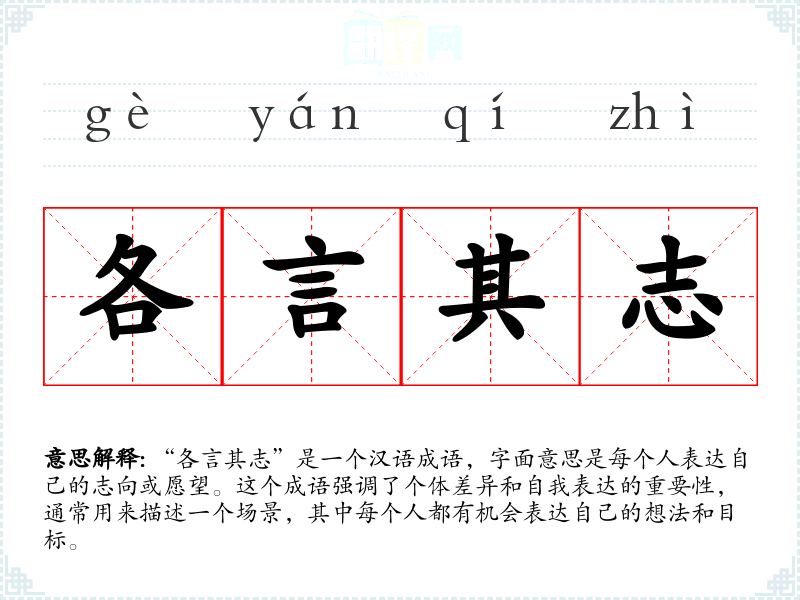 “各言其志”是一个汉语成语,字面意思是每个人表达自己的志向或愿望。这个成语强调了个体差异和自我表达的重要性,通常用来描述一个场景,其中每个人都有机会表达自己的想法和目标。