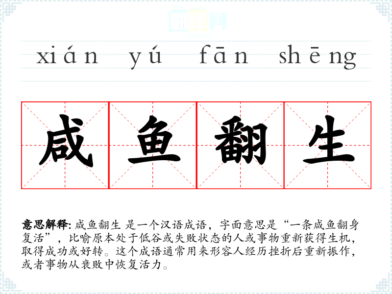 咸鱼翻生 是一个汉语成语,字面意思是“一条咸鱼翻身复活”,比喻原本处于低谷或失败状态的人或事物重新获得生机,取得成功或好转。这个成语通常用来形容人经历挫折后重新振作,或者事物从衰败中恢复活力。