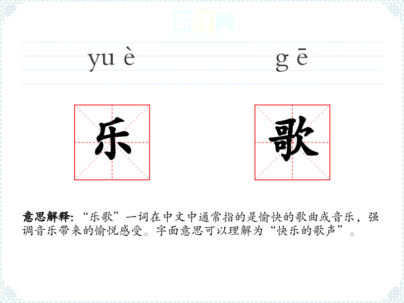 “乐歌”一词在中文中通常指的是愉快的歌曲或音乐,强调音乐带来的愉悦感受。字面意思可以理解为“快乐的歌声”。