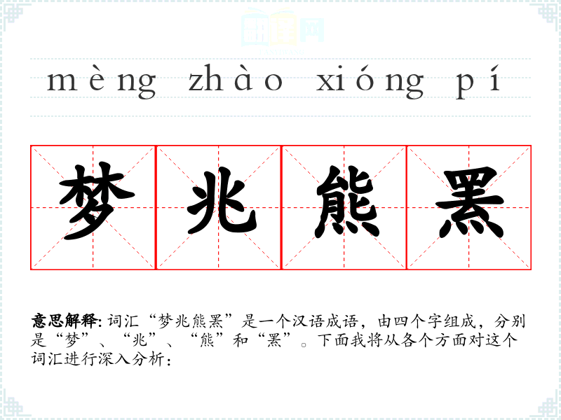 词汇“梦兆熊罴”是一个汉语成语,由四个字组成,分别是“梦”、“兆”、“熊”和“罴”。下面我将从各个方面对这个词汇进行深入分析: