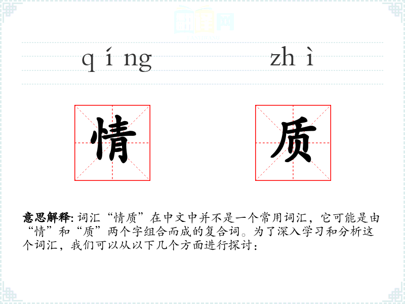 词汇“情质”在中文中并不是一个常用词汇,它可能是由“情”和“质”两个字组合而成的复合词。为了深入学习和分析这个词汇,我们可以从以下几个方面进行探讨: