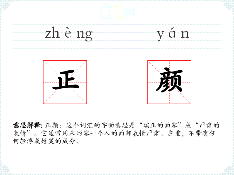正颜:这个词汇的字面意思是“端正的面容”或“严肃的表情”。它通常用来形容一个人的面部表情严肃、庄重,不带有任何轻浮或嬉笑的成分。