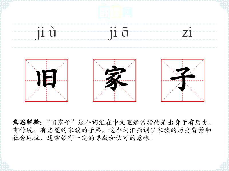“旧家子”这个词汇在中文里通常指的是出身于有历史、有传统、有名望的家族的子弟。这个词汇强调了家族的历史背景和社会地位,通常带有一定的尊敬和认可的意味。