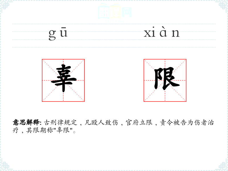 古刑律规定﹐凡殴人致伤﹐官府立限﹐责令被告为伤者治疗﹐其限期称"辜限"。