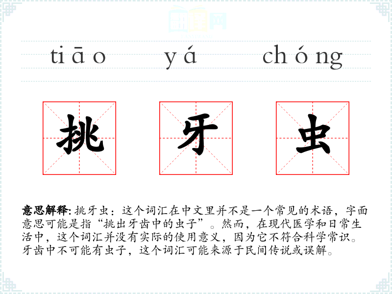 挑牙虫:这个词汇在中文里并不是一个常见的术语,字面意思可能是指“挑出牙齿中的虫子”。然而,在现代医学和日常生活中,这个词汇并没有实际的使用意义,因为它不符合科学常识。牙齿中不可能有虫子,这个词汇可能来源于民间传说或误解。