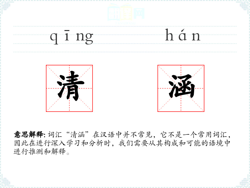 词汇“清涵”在汉语中并不常见,它不是一个常用词汇,因此在进行深入学*和分析时,我们需要从其构成和可能的语境中进行推测和解释。