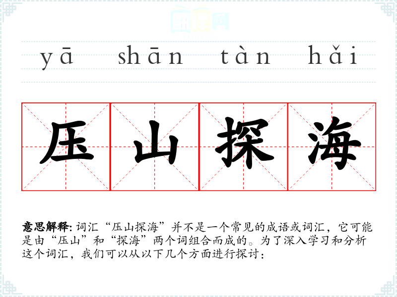 词汇“压山探海”并不是一个常见的成语或词汇,它可能是由“压山”和“探海”两个词组合而成的。为了深入学*和分析这个词汇,我们可以从以下几个方面进行探讨:
