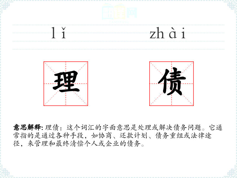 理债:这个词汇的字面意思是处理或解决债务问题。它通常指的是通过各种手段,如协商、还款计划、债务重组或法律途径,来管理和最终清偿个人或企业的债务。