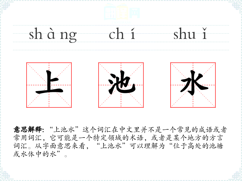 “上池水”这个词汇在中文里并不是一个常见的成语或者常用词汇,它可能是一个特定领域的术语,或者是某个地方的方言词汇。从字面意思来看,“上池水”可以理解为“位于高处的池塘或水体中的水”。