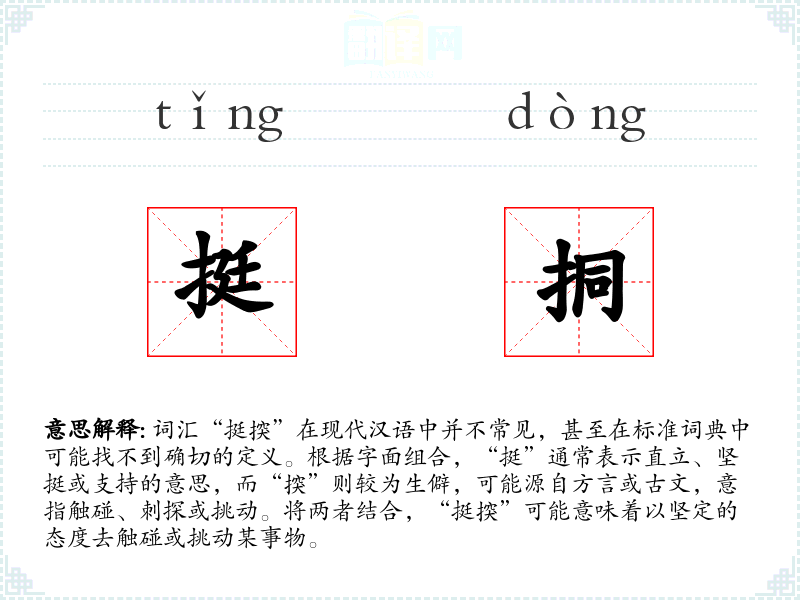 词汇“挺揬”在现代汉语中并不常见,甚至在标准词典中可能找不到确切的定义。根据字面组合,“挺”通常表示直立、坚挺或支持的意思,而“揬”则较为生僻,可能源自方言或古文,意指触碰、刺探或挑动。将两者结合,“挺揬”可能意味着以坚定的态度去触碰或挑动某事物。