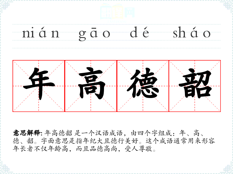 年高德韶 是一个汉语成语,由四个字组成:年、高、德、韶。字面意思是指年纪大且德行美好。这个成语通常用来形容年**不仅年龄高,而且品德高尚,受人尊敬。