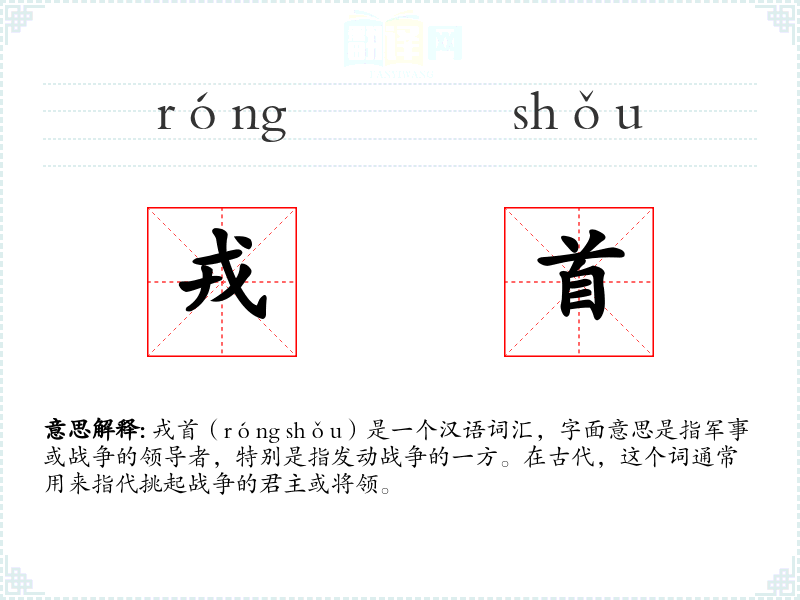 戎首(róng shǒu)是一个汉语词汇,字面意思是指军事或战争的领导者,特别是指发动战争的一方。在古代,这个词通常用来指代挑起战争的君主或将领。