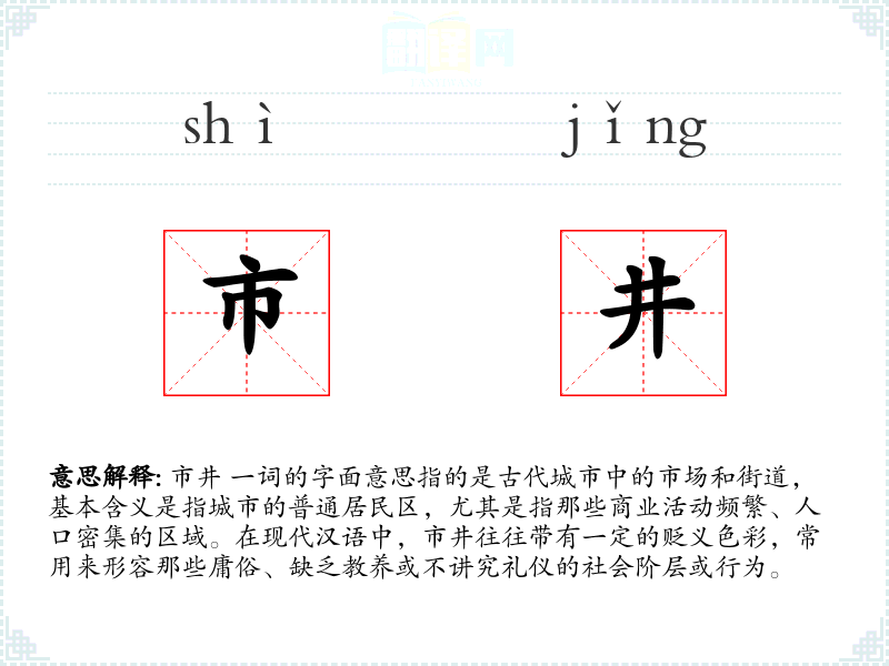 市井 一词的字面意思指的是古代城市中的市场和街道,基本含义是指城市的普通居民区,尤其是指那些商业活动频繁、人口密集的区域。在现代汉语中,市井往往带有一定的贬义色彩,常用来形容那些庸俗、缺乏教养或不讲究礼仪的社会阶层或行为。
